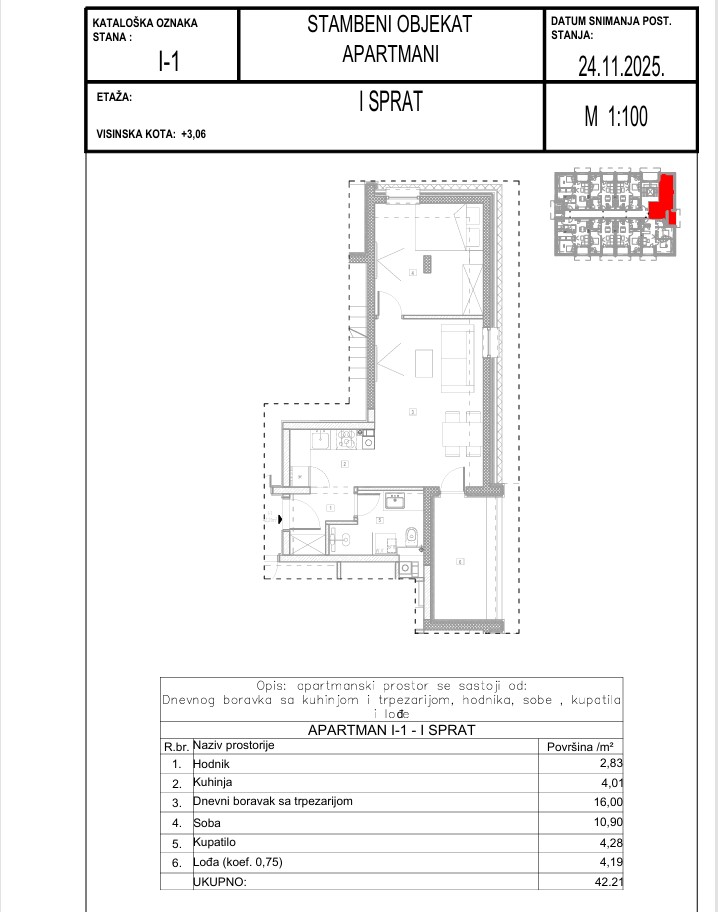 Apartman I-1 ima ukupnu kvadraturu od 42,21 m² i pažljivo je projektovan kako bi ponudio maksimalnu iskoristivost prostora. Sastoji se od dnevnog boravka s kuhinjom i trpezarijom, hodnika, spavaće sobe, kupatila i lođe.