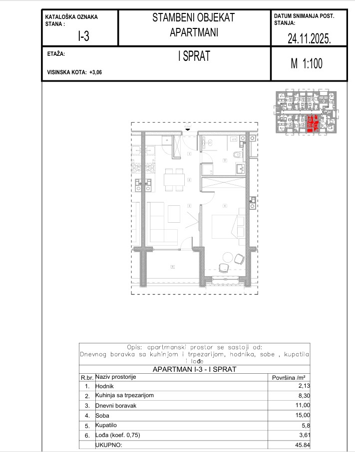 Apartman ima ukupnu kvadraturu od 45,84 m² i odlikuje se praktičnim i dobro organizovanim rasporedom. Sastoji se od dnevnog boravka s kuhinjom i trpezarijom, hodnika, spavaće sobe, kupatila i lođe.