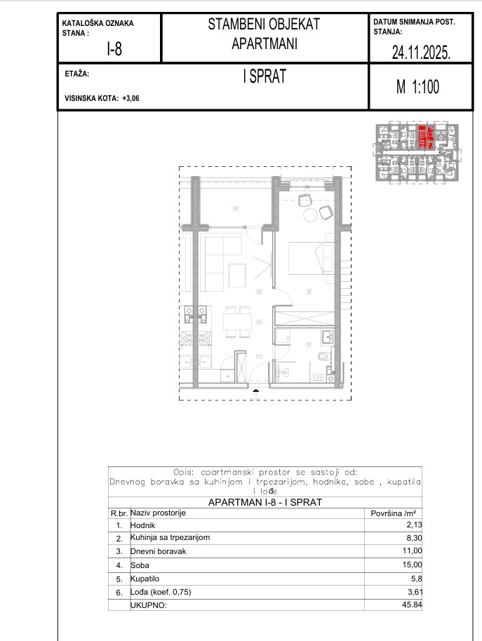 Apartman ukupne površine 45,84 m² nalazi se u novogradnji i odlikuje se praktičnim rasporedom prilagođenim savremenom načinu života. Prostor čine dnevni boravak s kuhinjom i trpezarijom, hodnik, spavaća soba, kupatilo te lođa.