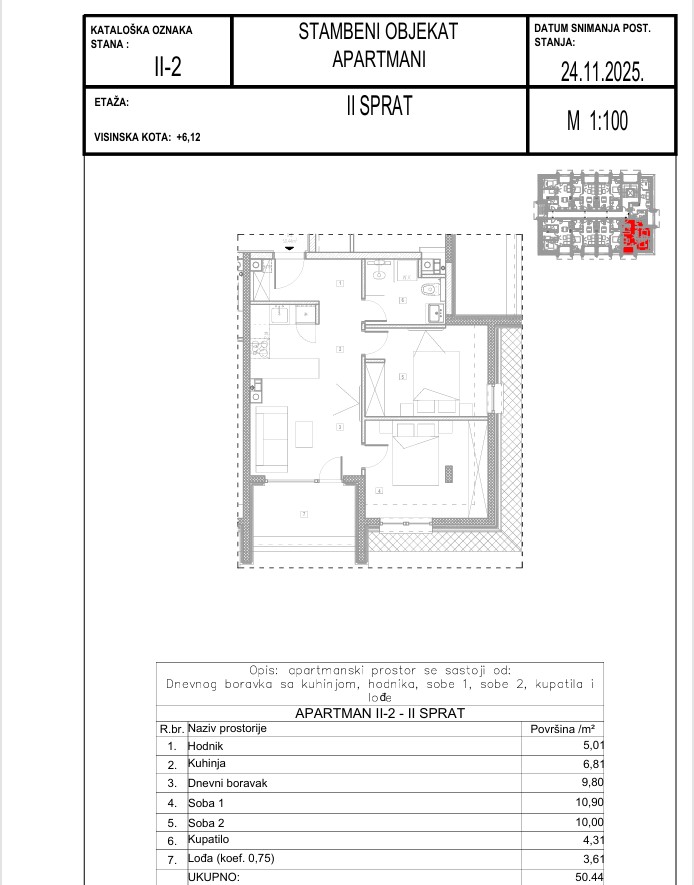 Apartman ukupne površine 50,44 m² ima funkcionalan i komforan raspored. Sastoji se od dnevnog boravka sa kuhinjom i trpezarijom, hodnika, spavaće sobe, kupatila te lođe.