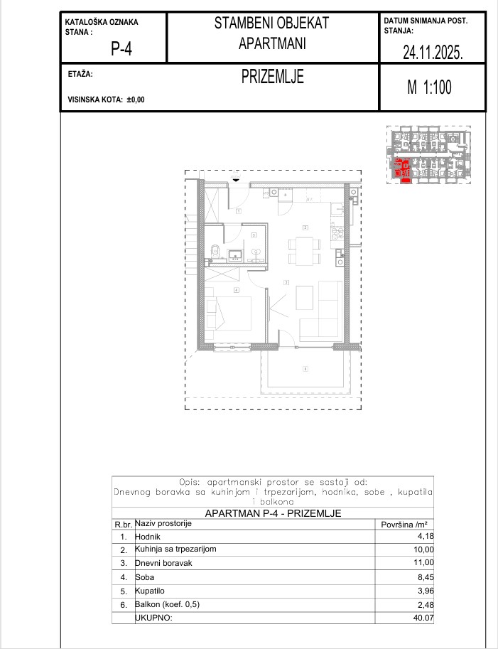 Apartman ukupne površine 40,07 m² osmišljen je za maksimalnu iskoristivost prostora i komfor. Sastoji se od: