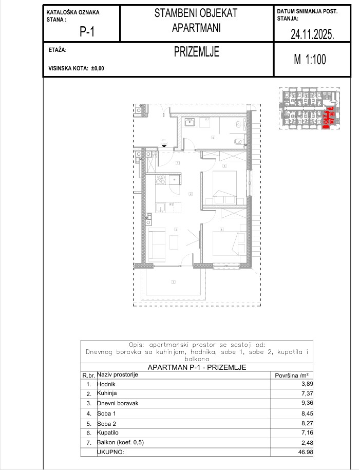 Apartman ukupne površine 47,64 m² pažljivo je projektovan kako bi maksimalno iskoristio prostor i prirodno svjetlo. Sastoji se od dnevnog boravka s kuhinjom, hodnika, dvije spavaće sobe, kupatila te balkona, koji pruža dodatni osjećaj komfora i povezanosti s planinskim okruženjem.